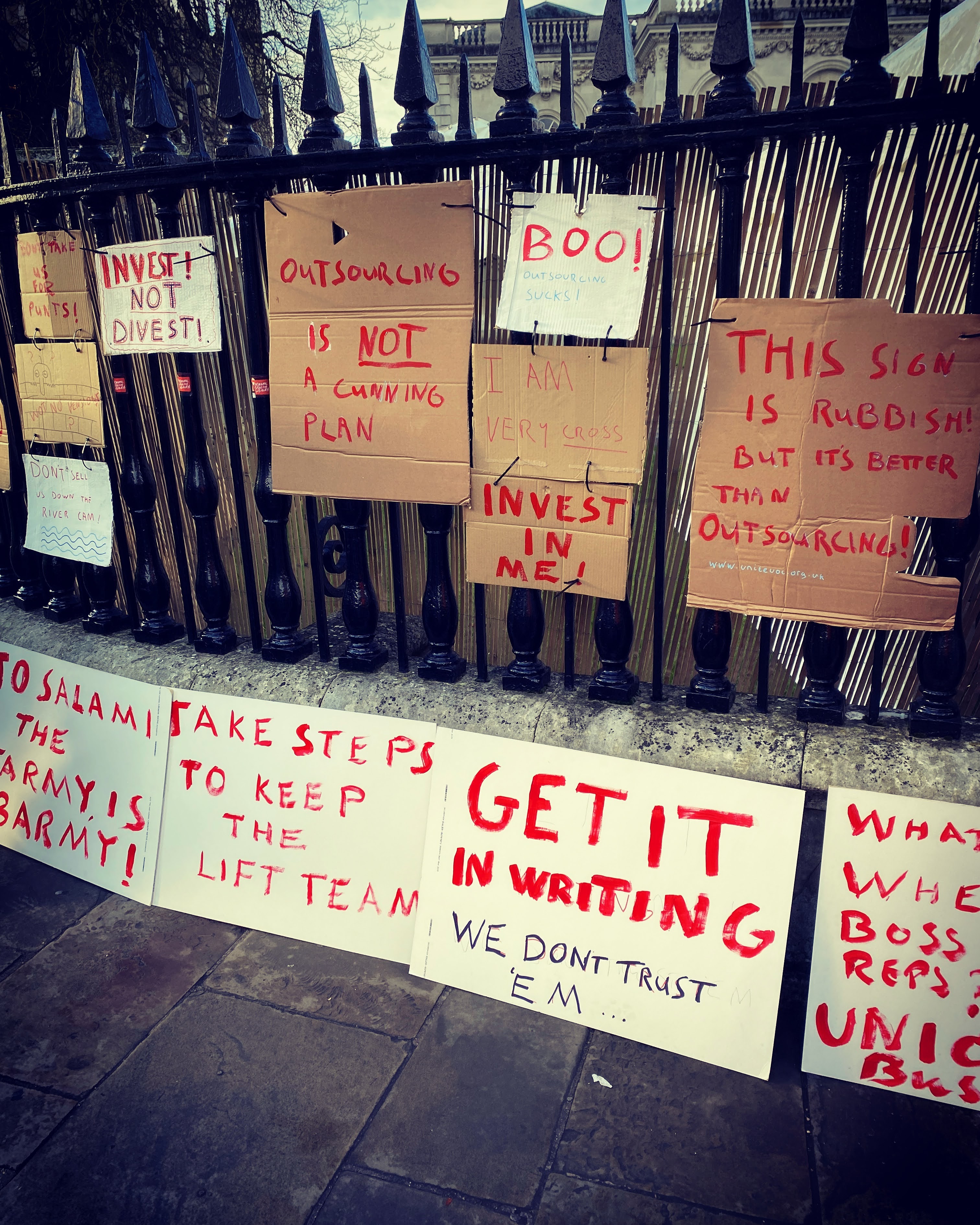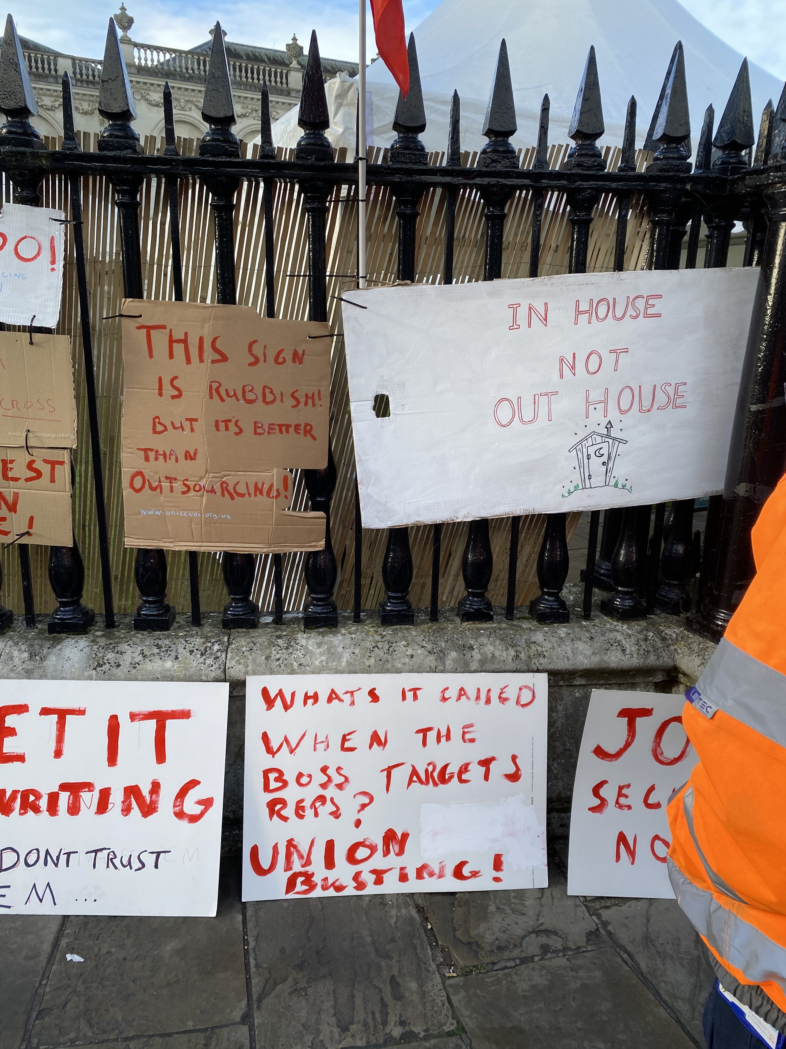 Placards We Got ‘Em Posted on 12th Dec 2021 by Robert Arrowsmith some of the pictures from our recent OUTSOURCING SUCKS! demos. Share this: Click to share on X (Opens in new window) X Click to share on Facebook (Opens in new window) Facebook Like Loading...